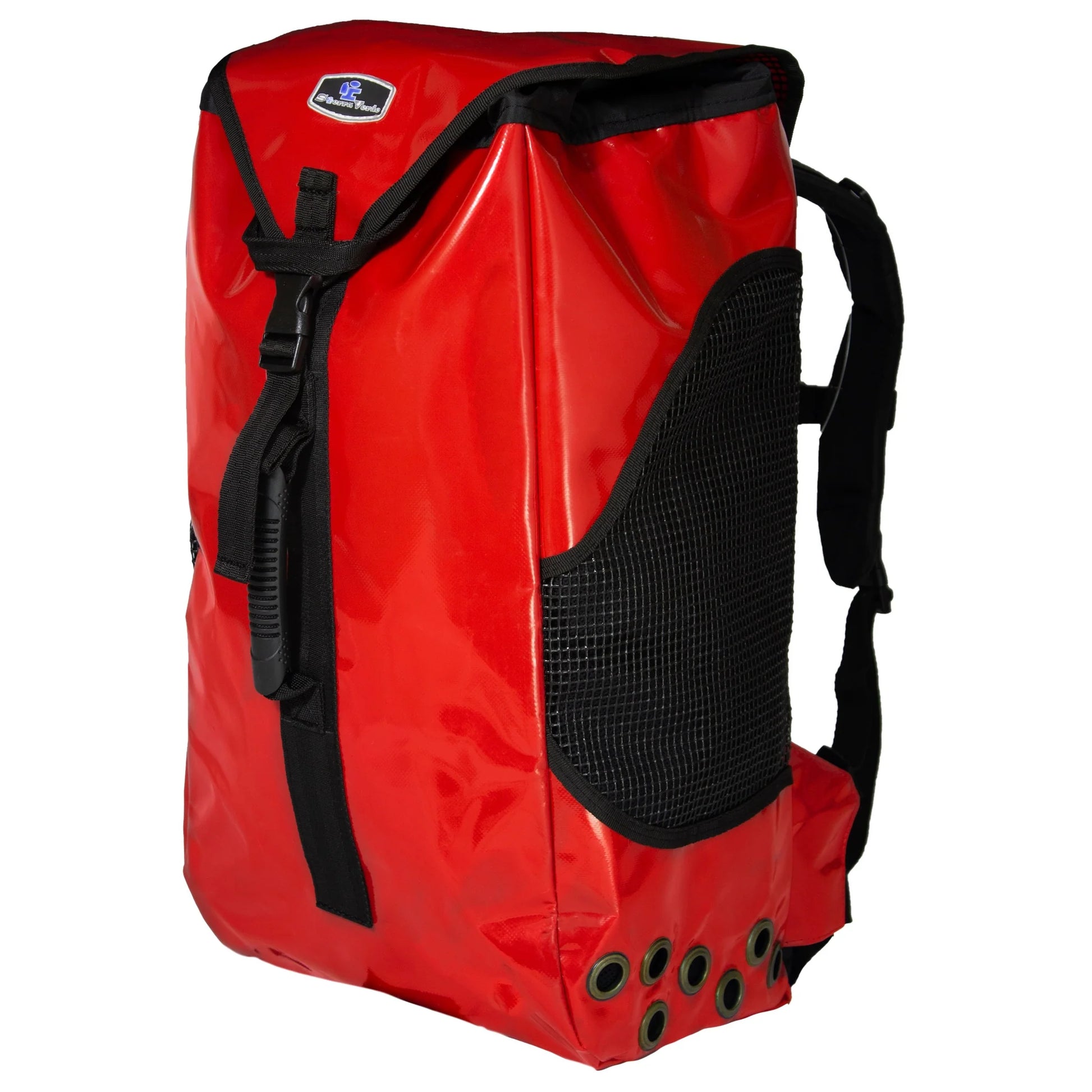 Características: Mochila para cañonismo tipo costal, con cargadores y cinta lumbar, sistema de desagüe en base con ojillos y costados de malla, tapa, bolsa interior, asa frontal.