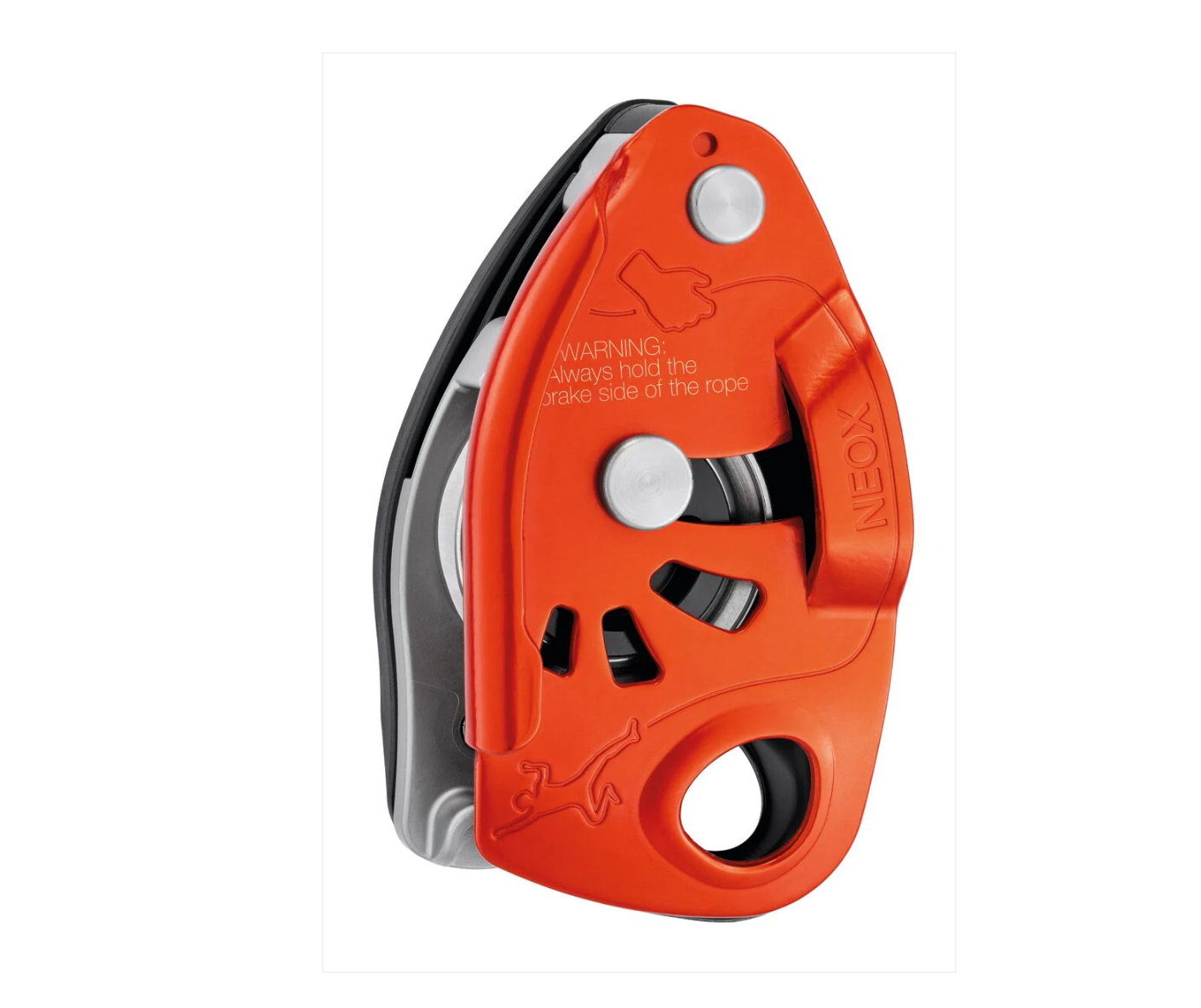 - Bloqueo asistido mediante leva que ofrece una gran tolerancia de la posición de la mano lado frenado, independientemente del ángulo entre la cuerda del escalador y la del lado frenado.