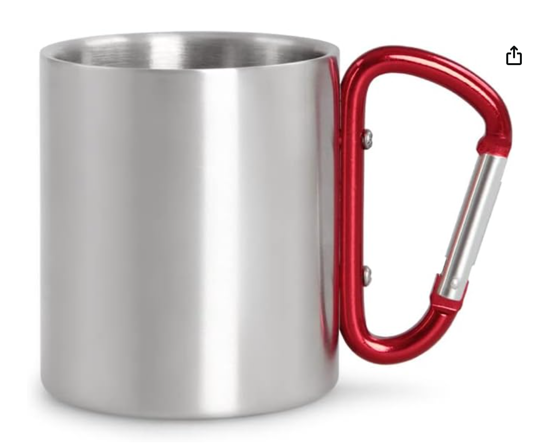 Taza vintage en esmaltado metálico de doble pared de acero inoxidable con asa de mosquetón. Capacidad de 300 ml.